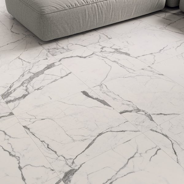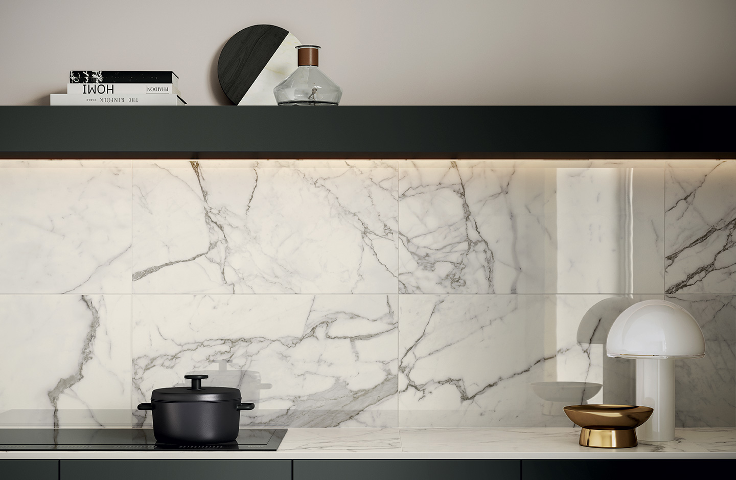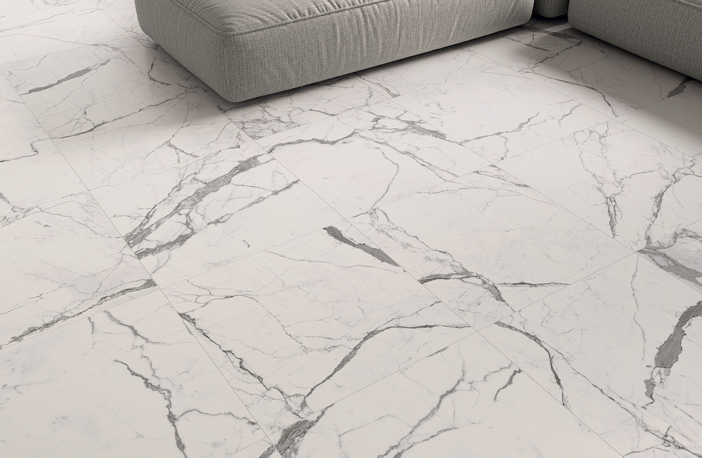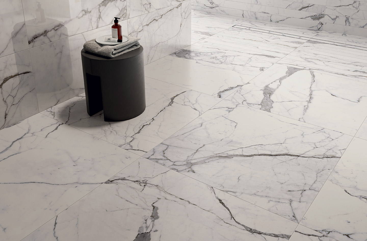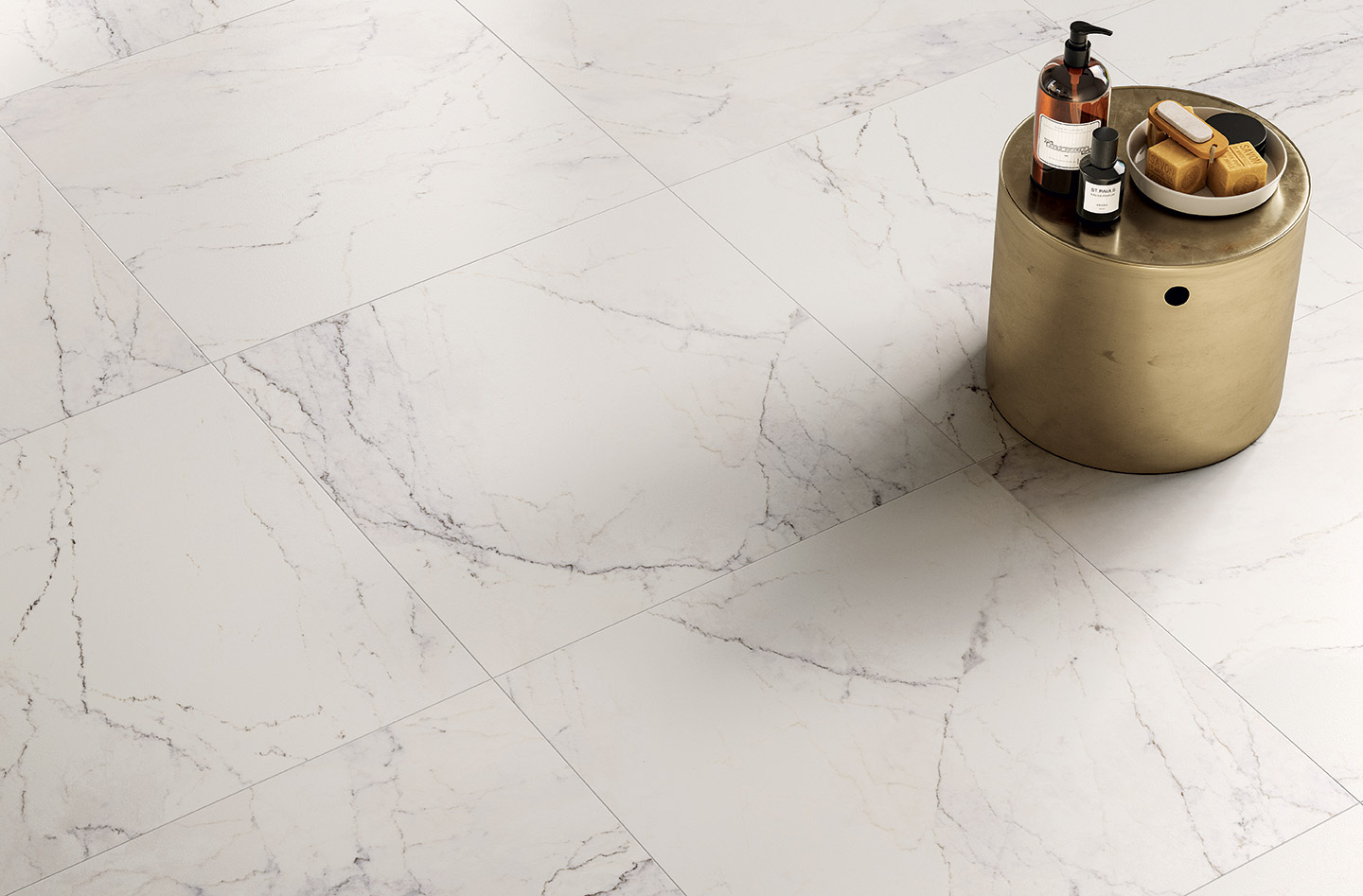Marble is the noble stone par excellence: for centuries now, it has been used in the decoration of both private homes and public buildings; be it inside or outside, on the floors or on walls. Marble slabs were on the floors of Roman domus and paved the forecourts and naves of cathedrals. It is a luxurious and precious material (especially when cut in large format), very expensive and poses some constraints in terms of maintenance. Marble effect tiles are an ideal solution, since they combine the technical advantages of ceramics (white body and, even more so, porcelain stoneware) with a very faithful reproduction of the different types of marble, down to the smallest detail.