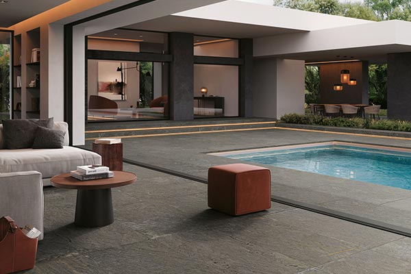 Slate is a natural stone that is often underestimated, even though it has so much potential. It can be used indoors as bathroom tiles, living room tiles, etc. Its shades allow you to create a contemporary mineral atmosphere. Slate can also be used as outdoor tiles to create a Zen garden for example.