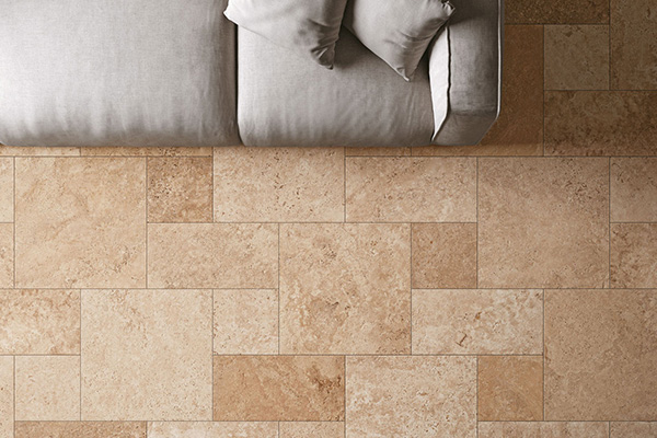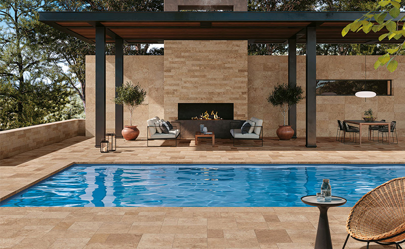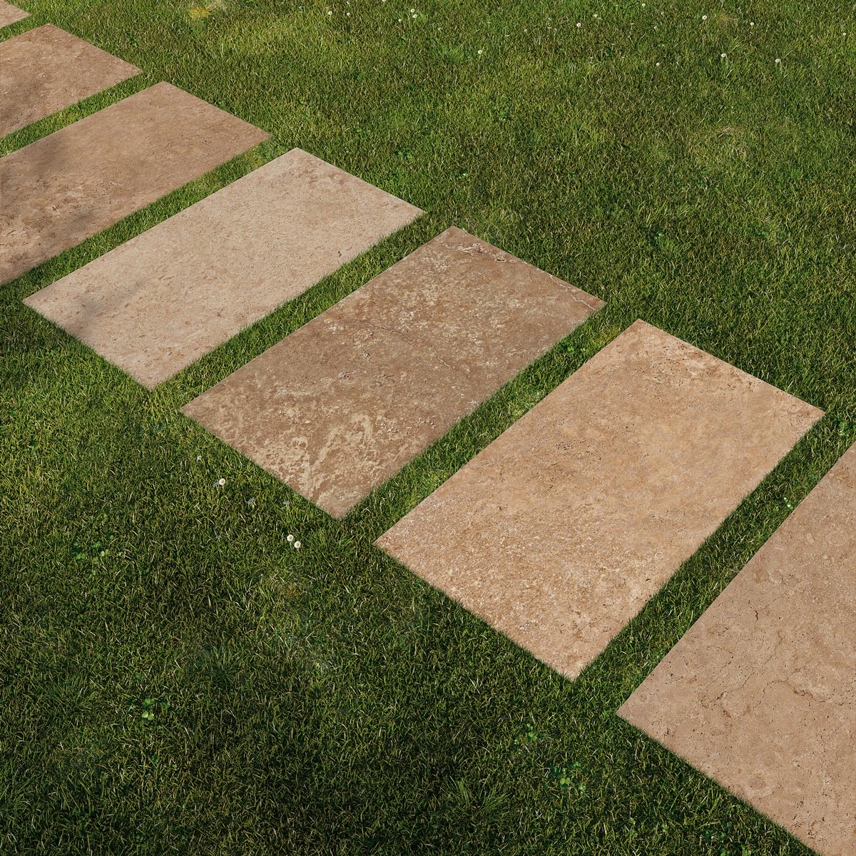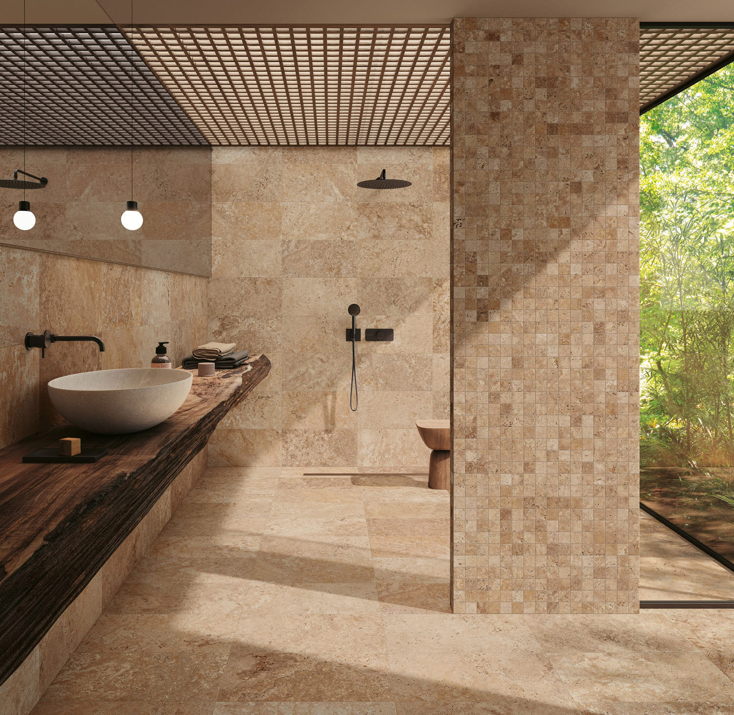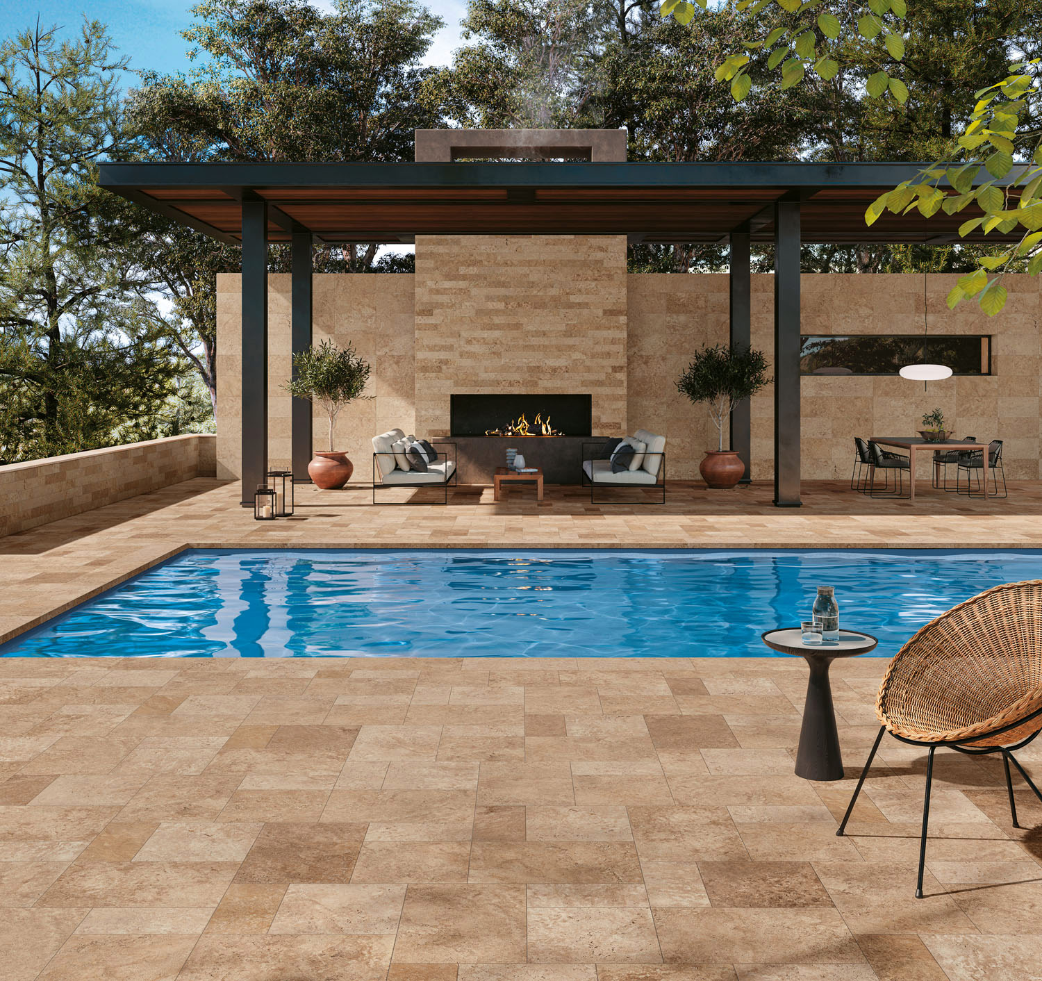 Finally, travertine style tiles are also available in a 20-mm thickness in the Outdoor Plus range, which is specially designed for outdoor use. In this case, other laying methods are possible, such as laying on gravel, lawn or a raised installation, and the traditional adhesive technique can be avoided. This aesthetic choice gives every exterior space, from gardens to terraces and balconies, a timeless and authentic design thanks to the softness of the various beige shades and the faithful reproduction of the original material.