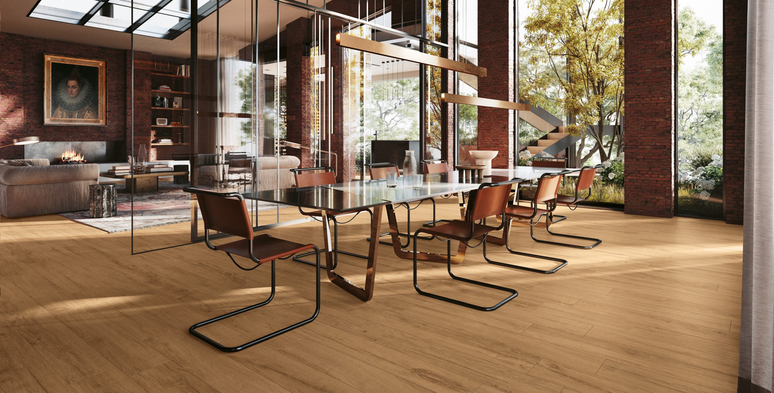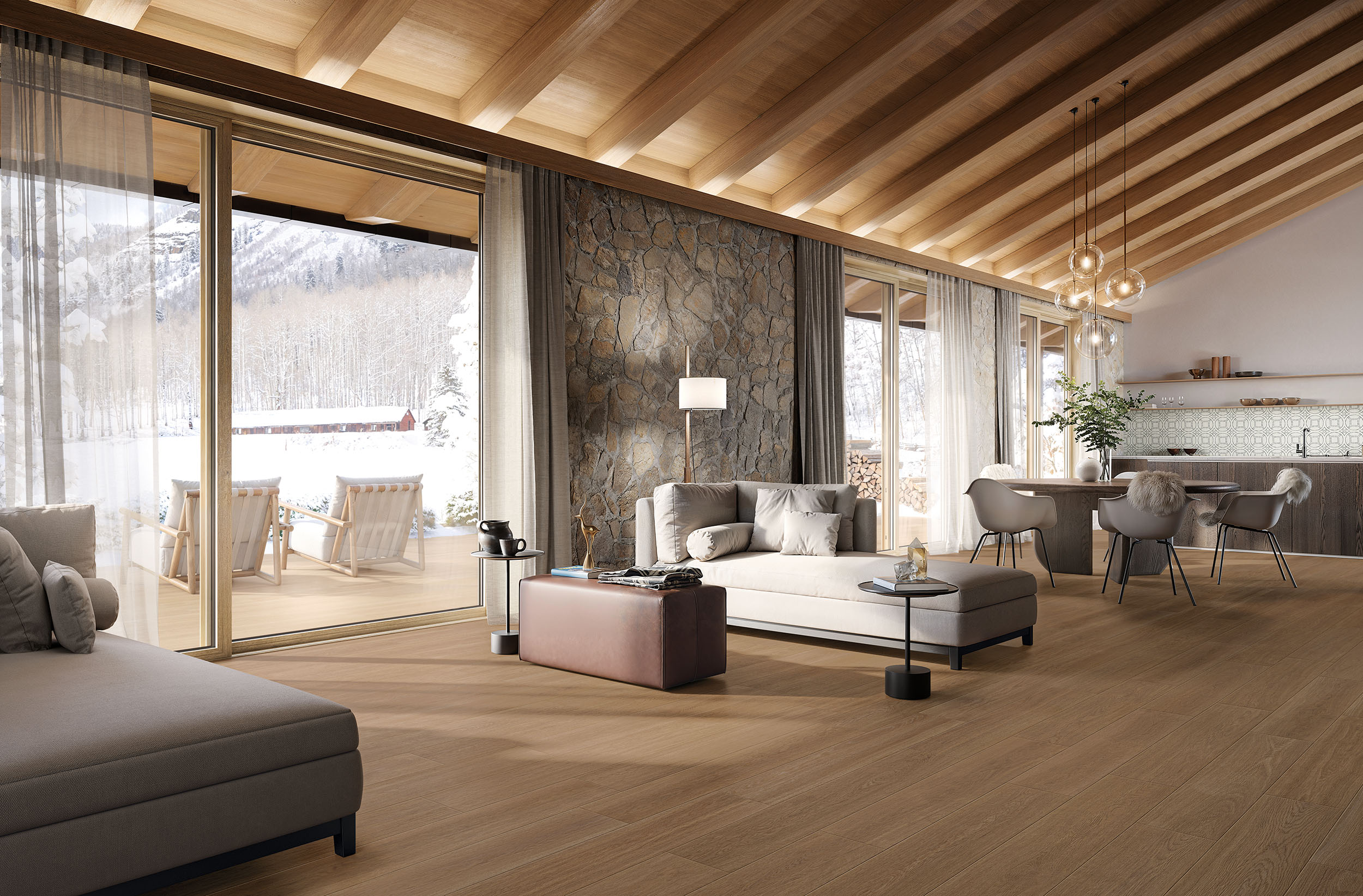 Ceramic wood tiles accurately replicate the visual appearance of natural wood, such as its grains and warm colours, but also its details to the touch. Wooden effect tiles reproduce in an extremely accurate and precise way the different types of wood, from the most classic ones such as antique or natural parquet, to the most contemporary ones such as grey wood.